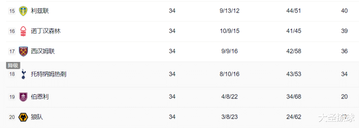 目前热刺积34分,西汉姆联36分。过往通用的40分保级安全线,今年或将彻底失效。